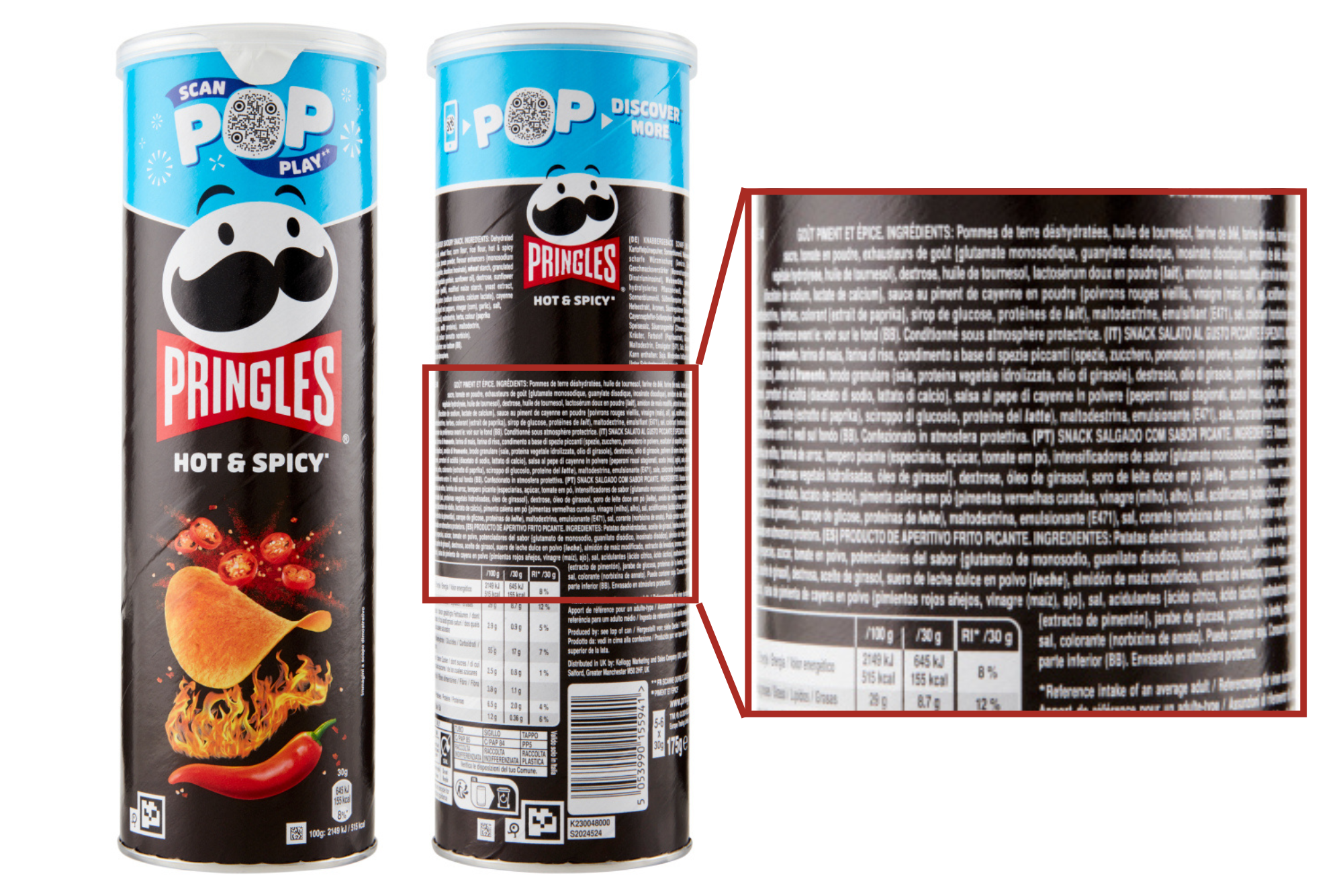 Le Pringles Hot & Spicy nel tubo da 185 g (esistono anche tubi da 175 g) hanno un apporto calorico di 515 kcal per 100 grammi e costano circa 15 euro al kg. Il prezzo non è però il problema principale. L’etichetta rappresenta un capolavoro di scrittura creativa, sia per la lunghezza della lista, sia per il numero di additivi (nove) che sono difficile da individuare perché quasi tutti indicati con il nome scientifico, senza la lettera ‘E’ che in genere non piace molto ai consumatori. Per capire meglio, l’E631 è un additivo esaltatore dell’aroma denominato ‘inosinato disodico’ ed è presente nelle Pringles. Sull’etichetta però è riportata solo la scritta ‘inosinato disodico’, alla stregua degli altri ingredienti, forse perché riportare nove volte la lettera “E” seguita da tre cifre potrebbe dequalificare il prodotto.