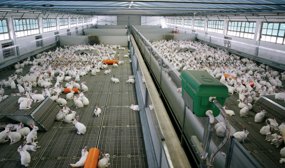 In Italia, qualcuno ha provato ad allevare conigli liberi in grandi capannoni, dove gli animali possono saltare, correre, appartarsi e giocare come farebbero in natura. La spettacolarità di queste strutture è scontata (vedi foto sopra), e anche da un punto di vista etico si tratta di un salto di qualità importante, ma ci sono diverse criticità. In un ambiente aperto la competizione e l’aggressività aumentano moltissimo, provocando un elevato indice di mortalità. Anche il valore di conversione mangime/carne diminuisce, mentre si registra un forte incremento della diffusione di malattie, con difficoltà oggettive nella gestione degli interventi di vaccinazione.