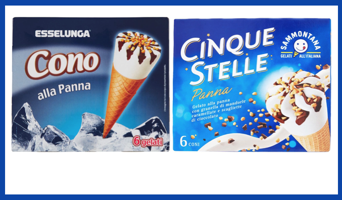 Cono alla panna: confronto fra Esselunga e Sammontana. Il produttore è lo stesso ma le ricette sono diverse. La crema di latte oltre il 13%!