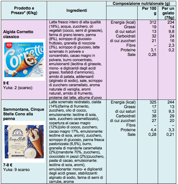 Se sottoponiamo questi prodotti al giudizio dell’app Yuka, che tiene conto sia degli aspetti nutrizionali sia della presenza di additivi, vediamo che il giudizio è sempre “scarso”, tranne nel caso nel cono di Grom valutato mediocre. Quest’ultimo, che fra l’altro contiene una quantità maggiore di latte fresco e panna (ingredienti di qualità), è privo di additivi valutati “rischiosi”, come i mono- e di-gliceridi degli acidi grassi e i fosfatidi d’ammonio, ma viene penalizzato dal profilo nutrizionale sbilanciato tipico di tutti questi gelati.