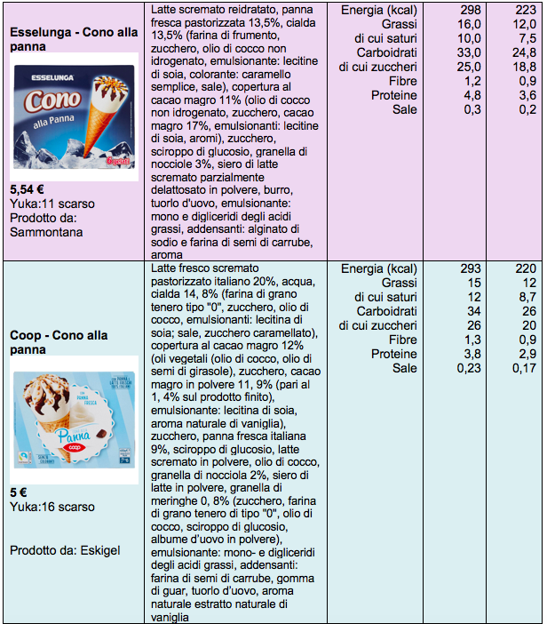 Il primo ingrediente è il latte: per Sammontana ed Esselunga (prodotto dalla stessa Sammontana) si tratta di latte scremato reidratato, mentre nelle ricette del Cornetto Algida, di quello a marchio Coop e del cono di Grom troviamo latte fresco, in quantità pari rispettivamente al 18%, 20% e 27%. Fra gli ingredienti del gelato possiamo trovare anche acqua e oli vegetali (nel cornetto Algida), oltre naturalmente a zucchero e sciroppo di glucosio. La panna è presente in tutti questi gelati, in percentuali che vanno dal 6,5% del cono Sammontana al 15% di quello Grom.