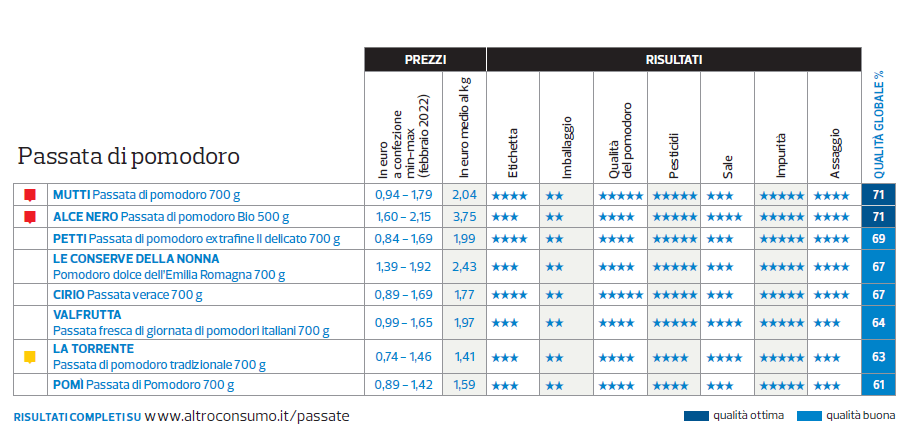 Date queste premesse, dalle quali si desume che non c’è una grande differenza tra i prodotti in termini di qualità, mentre cambiano in maniera significativa i prezzi, quali sono le conserve che emergono dai test? Tra le passate prese in esame, risultano migliori a pari merito, Mutti (2,04 €/kg) e Alce Nero biologica (3,75 €/kg), mentre la più conveniente è la passata di pomodoro tradizionale La Torrente (1,41 €/kg). Per quanto riguarda le polpe, emerge come miglior prodotto e al contempo miglior acquisto la polpa firmata Esselunga che ha un prezzo medio di 1,09 €/kg e vanta un punteggio buono o ottimo su tutti gli aspetti esaminati.