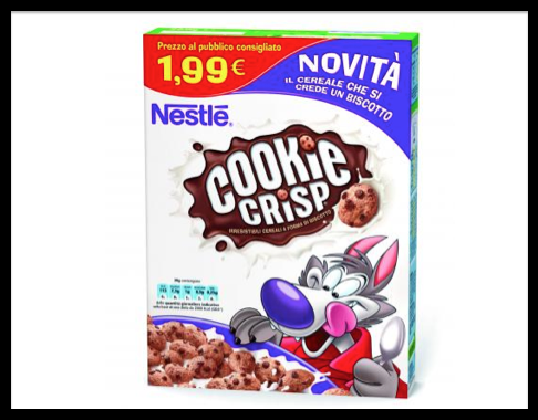 I Cookie Crisp sono gli ultimi nati tra i cereali per la prima colazione della Nestlè, la cui novità sta nella forma. È scritto a chiare lettere sulla facciata della scatola: “Novità il cereale che si crede un biscotto” e “cereali a forma di biscotto”. Si tratta di un mix di cereali, farine, zucchero, cacao, oli, aromi, sale, a forma di piccolissimi biscottini, tondi con all’interno gocce di cioccolato.