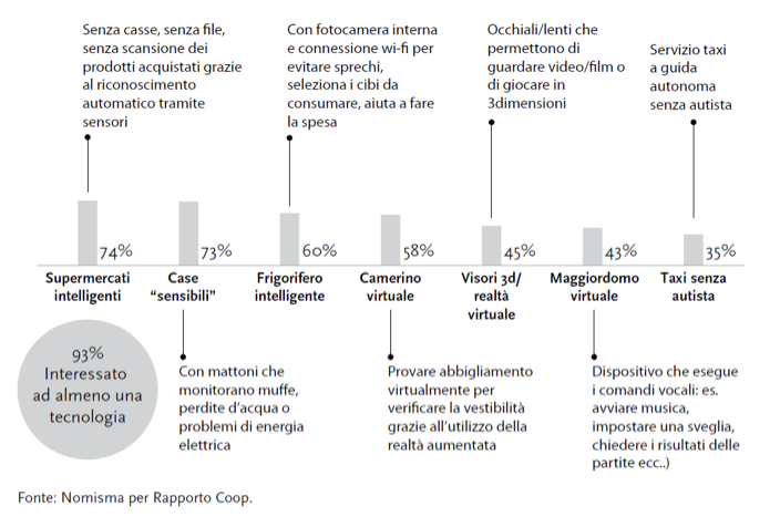 Nel settore delle nuove tecnologie, nove persone su dieci si dicono interessate a provare almeno un’innovazione che sarà sul mercato nel 2017. C’è grande curiosità intorno ai punti vendita intelligenti: quasi il 75% degli intervistati vorrebbe fare la spesa almeno una volta in un supermercato senza casse e senza file, grazie al sistema di scansione automatica dei prodotti effettuata con speciali sensori. Di intelligente, però, c’è anche il frigorifero, sogno del 60% degli italiani, che con fotocamera interna e connessione wi-fi permette di tenere traccia del cibo ed evitare sprechi.
