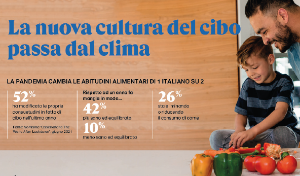 La tavola degli italiani esce profondamente trasformata dalla pandemia e si colora di verde, tanto che secondo il “Rapporto Coop 2021 – Economia, consumi e stili di vita di oggi e di domani” presentato il 7 settembre a Milano, un cittadino su sei dichiara di adeguare il proprio regime alimentare per ridurre l’impatto ambientale. Ma non tutto il panorama è così roseo, perché il 23% delle persone in questo periodo di crisi dichiara di avere acquistato peso (in media 5,8 kg) a fronte di un 15% che indica di averlo perso (- 7,1 kg). Sempre restando sul tema solo il 18% non si riconosce in una precisa cultura alimentare, mentre il 24% fa riferimento alla dieta mediterranea e la metà si riconosce anche o esclusivamente in altre identità (bio, veg&veg, gourmet, iperproteici e low carbs).