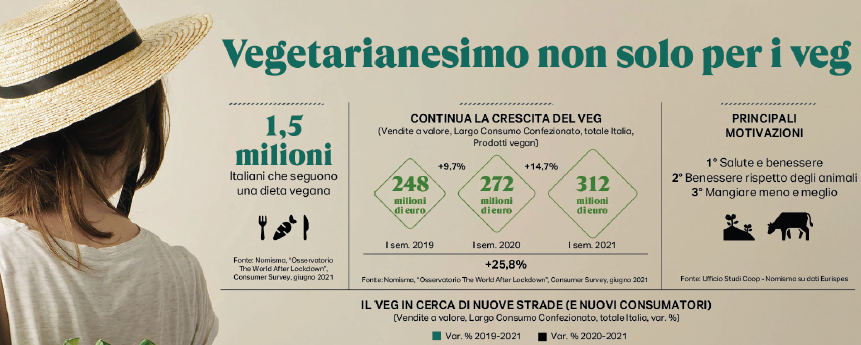 Ma la vera novità del Rapporto Coop 2021 è la comparsa della nuova tribù dei climatariani, ovvero di coloro che dichiarano di adeguare il proprio regime alimentare per ridurre l’impatto ambientale. C’è poi l’ambiente che diventa riferimento di molte persone; l’88% associa al cibo il concetto di sostenibilità che significa per il 33% avere un metodo di produzione rispettoso. Per un altro 33% vuol dire porre maggiore attenzione agli imballaggi, per il 21% è sinonimo di origine e filiera mentre per il 9% di responsabilità etica. Sull’onda di questi cambiamenti di tendenza il 13% dei cittadini sta riducendo il consumo di carne. I cibi veg sono consumati anche da chi cerca solo una alternativa proteica alla carne, mentre raddoppiano le vendite di proposte vegane di nuova generazione (bevande, besciamelle, piatti pronti…). Non si può considerare casuale il fatto che gli italiani riconoscano nel riscaldamento climatico il principale fattore di cambiamento del cibo del futuro, sia prevedendo una maggiore scarsità a causa del climate change (26%), sia immaginando che per salvare il clima occorrerà cambiare la nostra alimentazione (32%). Per molte persone un aiuto verrà dalla scienza e dalla tecnologia (26%) e, in questo senso, tra i nuovi prodotti alimentari da qui a 10 anni ci saranno cibi vegetali con il sapore di carne, a base di alghe, farina di insetti e anche la carne coltivata in vitro.