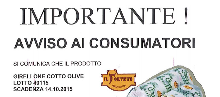 La catena di supermercati Coop ha pubblicato online un avviso per il richiamo del prodotto di gastronomia a base di pasta filata “Girellone farcito” della marca Il Forteto (vedi comunicato sotto). Si tratta di una sfoglia sottile di mozzarella spianata e arrotolata a mano, farcita con prosciutto cotto e olive.