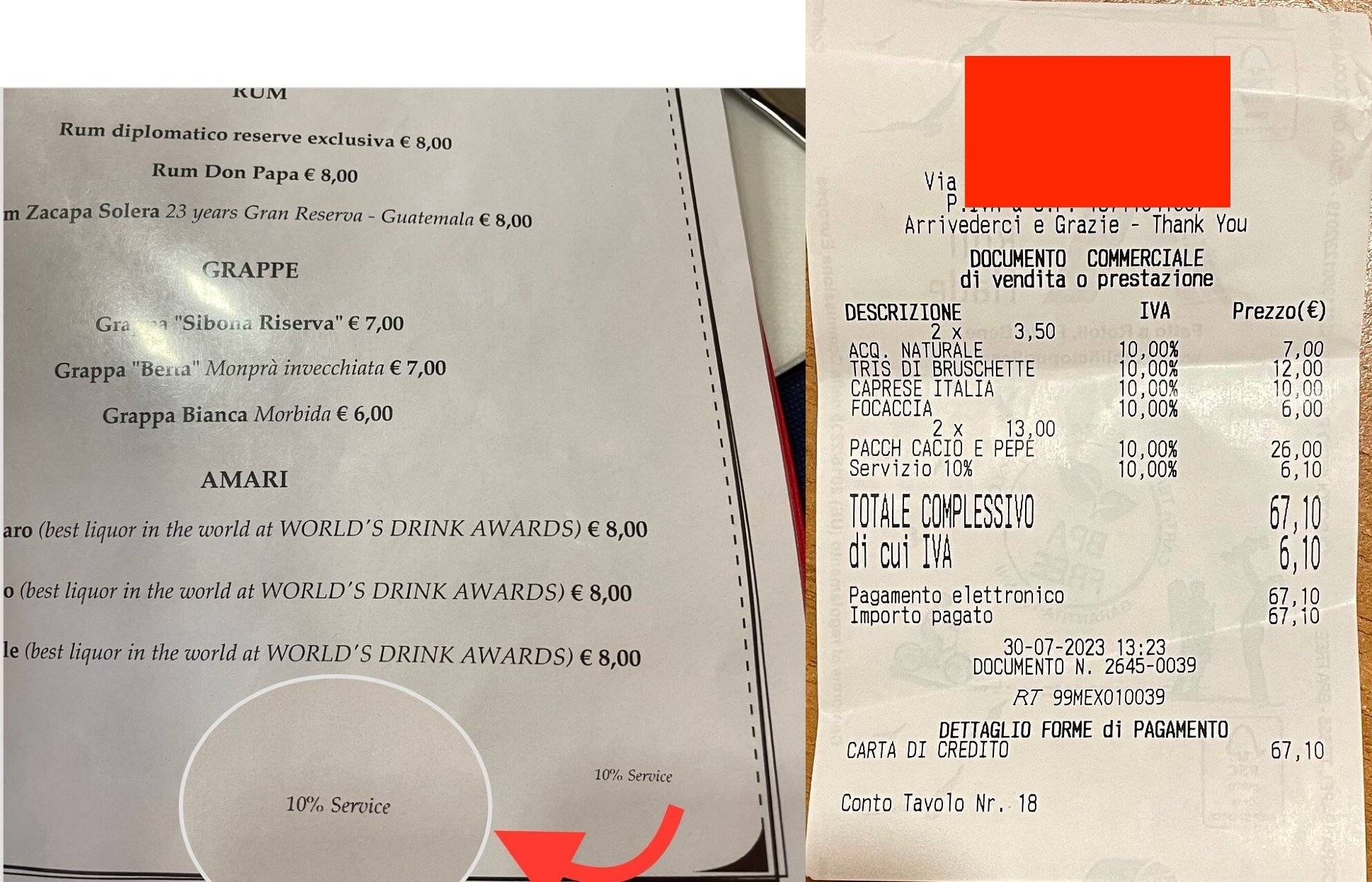 A Roma in un ristorante “acchiappaturisti” il coperto non era scritto da nessuna parte, però alla fine del menù dopo i distillati in basso a destra in caratteri minuscoli c’è il costo del “servizio” scritto solo in inglese, un bel 10% sul totale dello scontrino. Il bello è che nello scontrino mettono questo costo del 10% come IVA. Quindi i prezzi sul menu sembrano IVA compresa (come di solito si fa) ma poi aggiungono un “servizio” del 10% giustificandolo nello scontrino come tassa ma a tutti gli effetti intascandolo legalmente… geniale.