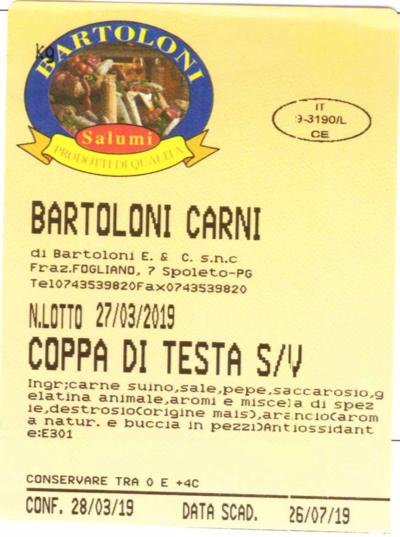 La coppa di testa richiamata è stata prodotta da Bartoloni Carni di Bartoloni Elisabetta & C. Snc nello stabilimento di frazione Fogliano 7, a Spoleto, in provincia di Perugia (marchio di identificazione: IT 9-3190/L CE).