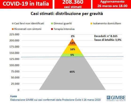 In Italia sono 208 mila le persone colpite dal coronavirus Covid-19, la stima è indicata il 26 marzo dalla Fondazione Gimbe (centro di ricerche che realizza studi sulla sanità). Si tratta di numeri molto superiori rispetto a quelli indicati ieri dalla Protezione civile (circa 80 mila). Per fortuna il 65% dei soggetti indicati da Gimbe (128 mila) risulta asintomatico o manifesta leggere forme influenzali, e difficilmente si rivolgerà al medico di famiglia. Purtroppo la stima dei contagi elaborata è simile a quella fatta dai cinesi, secondo cui il 60% dei soggetti contagiati dal virus era asintomatico e non veniva contabilizzato nei dati ufficiali (questa storia l’abbiamo raccontata in questo articolo sul contenimento del contagio in Cina).