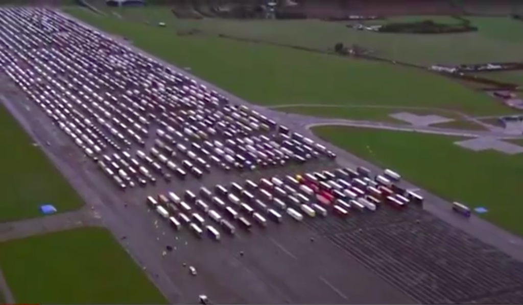 Hundreds of backed-up lorries queue to cross the Channel into France as a former airfield turns into a makeshift lorry park.