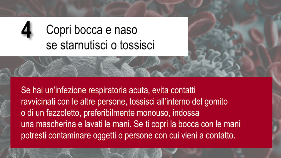 Le regole sono molto chiare: lavare frequentemente e accuratamente le mani con acqua e sapone o gel disinfettante a base di alcool; evitare di toccare bocca, naso e occhi (principali vie di accesso del virus) con le mani sporche; coprire naso e bocca con un fazzoletto di carta (da gettare dopo l’uso) o con l’incavo del gomito; non condividere con altri asciugamani, bicchieri, posate e stoviglie.