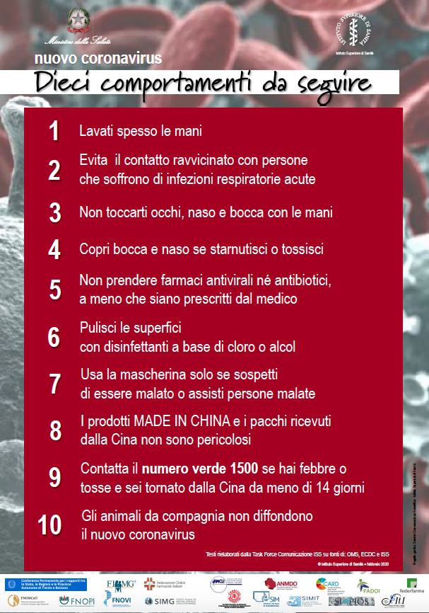 Ma cosa fare si chiede la gente? Ecco le dieci regole da seguire diffuse dal ministero della Salute e dall’Istituto superiore di sanità hanno. I dieci punti che spaziano dal lavarsi spesso le mani o pulire le superfici cercando così di contrastare le fake news che girano in rete e sui social. Il manifesto ha raccolto l’adesione degli ordini professionali medici e delle principali società scientifiche (*) e viene proposto anche come poster.