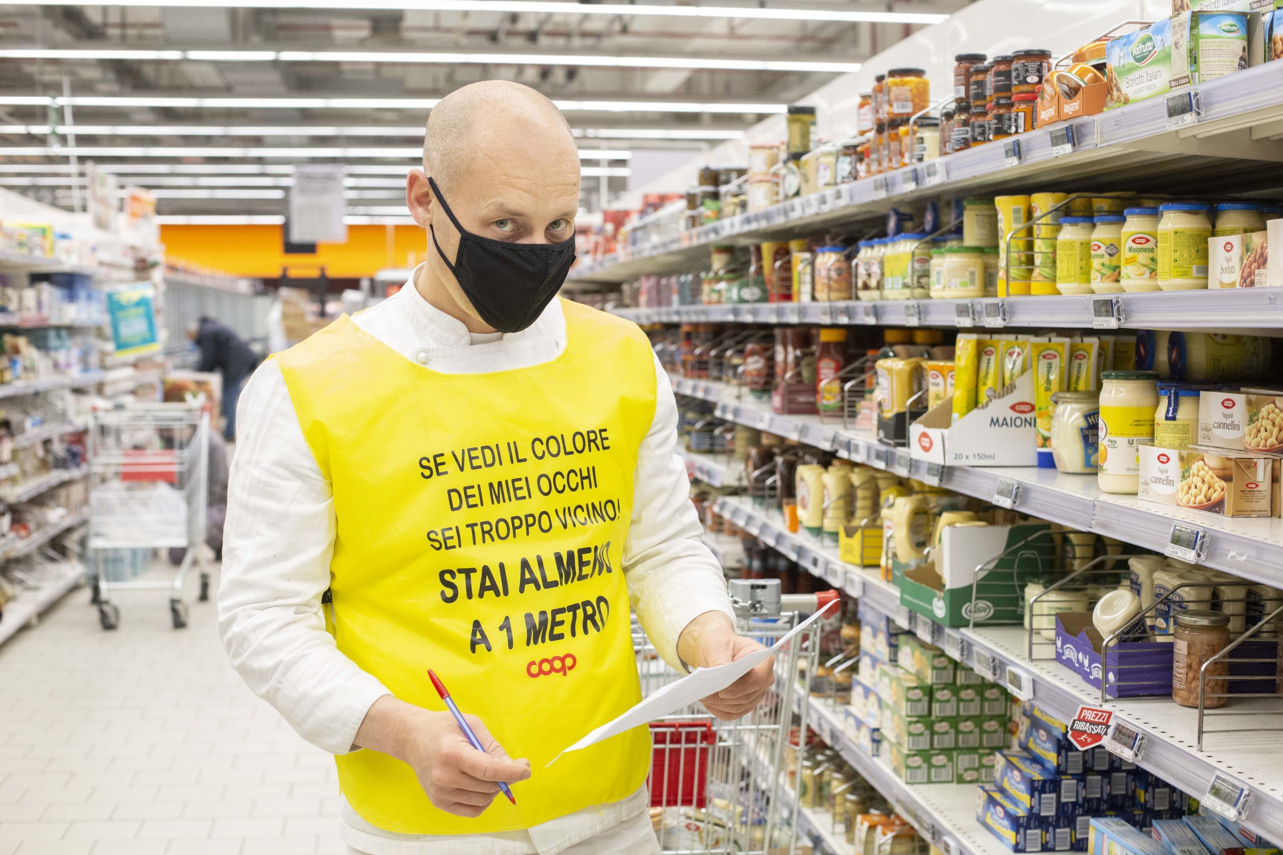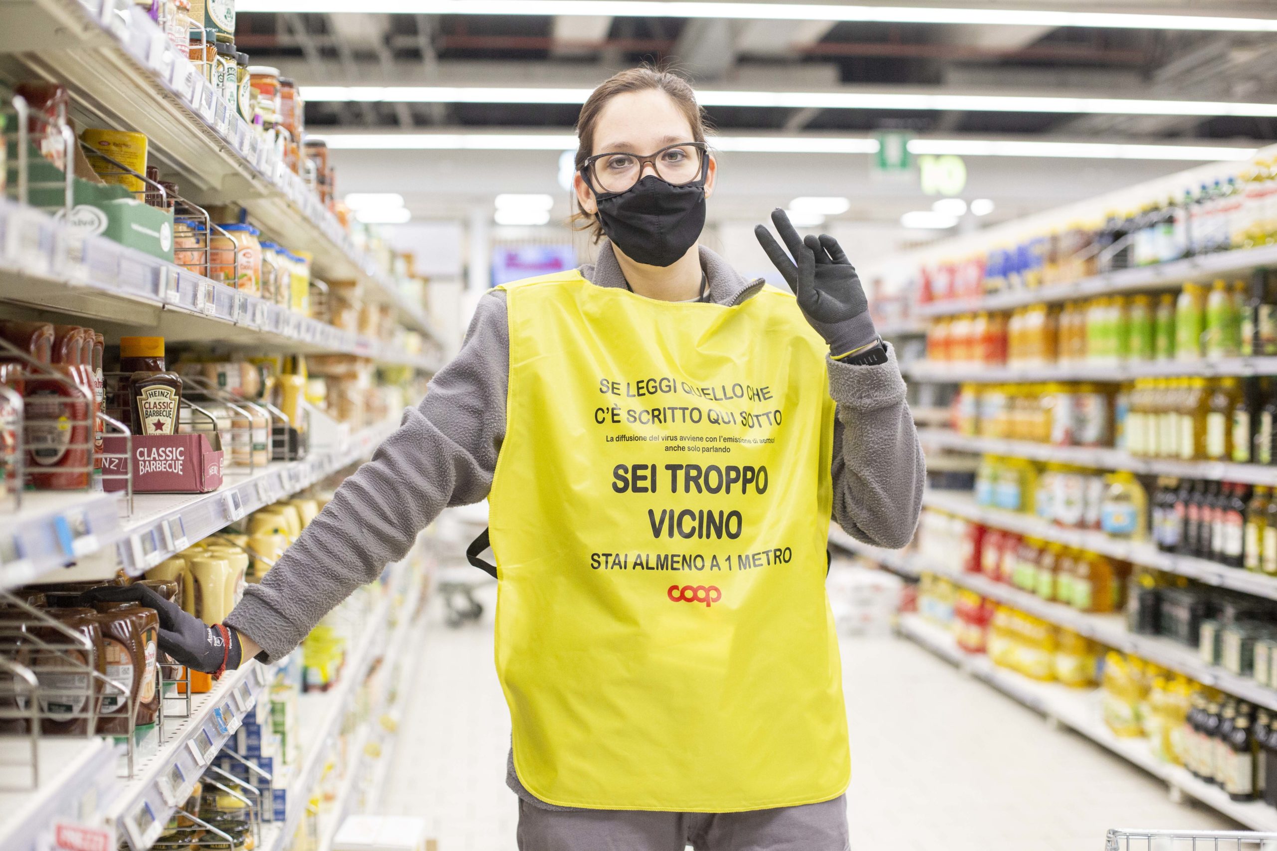 Da sabato 4 aprile nei supermercati Coop Lombardia è partita una nuova iniziativa per proteggere dipendenti e consumatori dal rischio coronavirus. Tutto il personale addetto alla vendita indossa una pettorina gialla con un messaggio che ricorda ai clienti di mantenere le distanze di sicurezza. Su alcune si legge “Se vedi il colore dei miei occhi sei troppo vicino! Stai almeno a 1 metro” oppure “Se leggi quello che c’è scritto qui sotto – La diffusione del virus avviene con l’emissione di aerosol anche solo parlando (in caratteri piccolissimi) – sei troppo vicino. Stai almeno a 1 metro”.