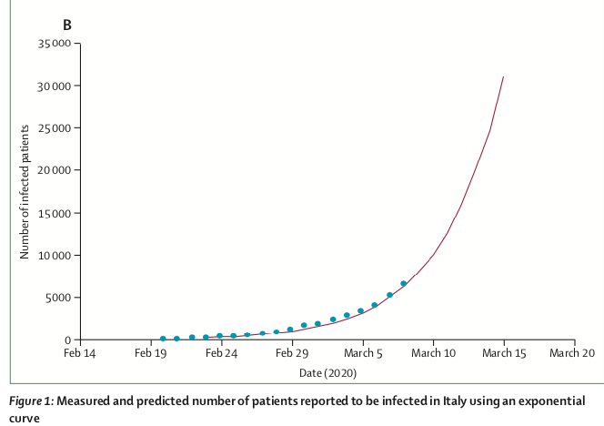 “In Italia – scrivono Giuseppe e Filippo Remuzzi sul Lancet – abbiamo circa 5.200 posti letto in unità di terapia intensiva. Dall’11 marzo, ci sono 1.028 postazioni dedicate a pazienti con infezione da SARS-CoV-2, e nel prossimo futuro il numero aumenterà progressivamente. Se l’incremento seguirà questo trend per la settimana successiva, ci saranno oltre 30.000 persone infette entro il 15 marzo, come mostrato nella figura 1B [vedi grafico sopra]. Considerando che il numero di letti disponibili nelle unità di terapia intensiva in Italia è vicino a 5.200 e, supponendo che la metà di questi letti possa essere utilizzata per i pazienti colpiti da coronavirus, il sistema sarà alla massima capacità, secondo questa previsione, entro il 14 marzo”(*).