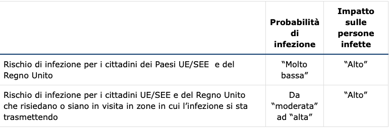 L’altra notizia è la nuova valutazione del rischio di infezione da coronavirus 2019-nCoV (ora chiamato ufficialmente SARS-CoV2) per i cittadini dei Paesi UE/SEE (Unione europea/Spazio economico europeo) e del Regno Unito elaborata il 10 febbraio dall’Ecdc. Il rischio per queste persone è considerato basso, mentre per i cittadini europei che risiedono o si trovano in visita in zone dove l’infezione si sta trasmettendo è, al momento, alto (vedi tabella sotto).