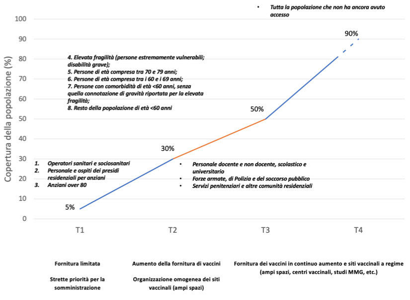 Secondo il nuovo piano, le vaccinazioni saranno quindi effettuate per età e condizioni di vulnerabilità dovute alla presenza di patologie e disabilità. Su queste basi, la popolazione è stata suddivisa in cinque gruppi: