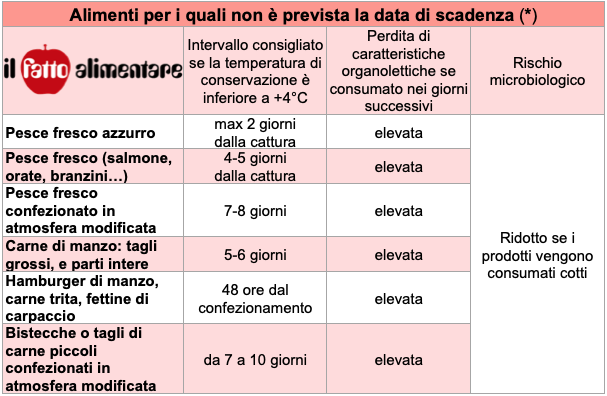Per carne e pesce freschi la legge non prevede la data di scadenza. Ci sono però catene di supermercati che vendono questi alimenti confezionati in vaschette di polistirolo con un’etichetta, dove è indicata sia la data di confezionamento, sia quella di scadenza. Stabilire regole rigide è difficile perché l’intervallo varia in funzione del tipo di pesce o di carne, della qualità microbiologica iniziale, del sistema di confezionamento e altri fattori. Per esempio nel settore ittico si passa da un intervallo massimo di due giorni dopo la cattura (pesce azzurro), fino a 4-5 per orate e branzini.