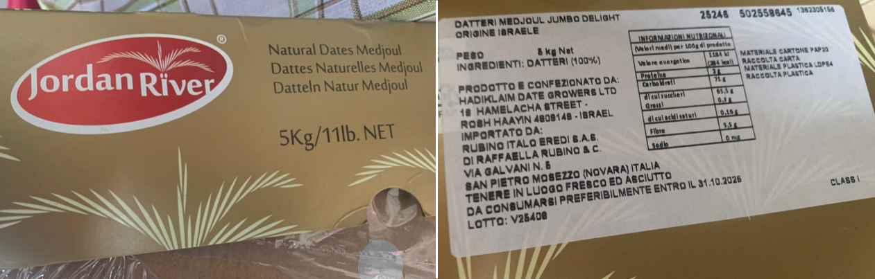 Da gennaio 2025 è entrata in vigore una legge che estende alla frutta secca (oltre alla frutta a guscio anche agrumi essiccati, uve secche, banane, fichi secchi) l’obbligo di indicarne l’origine in etichetta. La norma prevede una sola eccezione: i datteri. Per questo motivo nei supermercati come Esselunga e Iperal si trovano datteri, coltivati nei territori Palestinesi occupati illegalmente dagli israeliani, che non riportano sempre chiaramente l’origine, rendendo difficile fare una scelta consapevole.