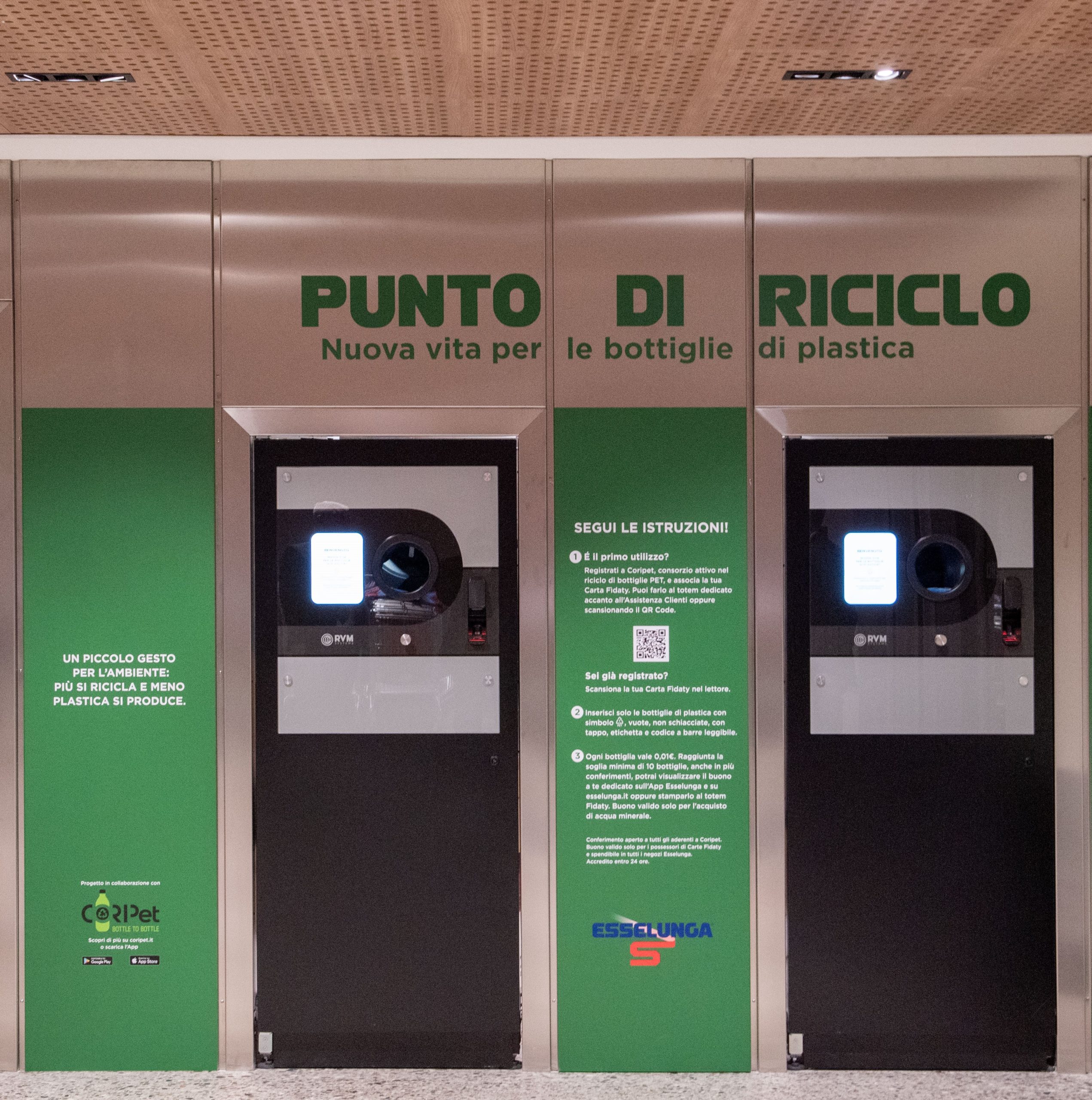 Si tratta ovviamente di un meccanismo differente rispetto a quello del deposito cauzionale. Il valore del premio è attualmente minimo, se paragonato a quello della cauzione. Nel secondo caso, però, non si tratta di un premio, ma di una restituzione. “Come consorzio Epr (responsabilità estesa del produttore) applicheremo la normativa che entrerà in vigore – prosegue Pasquarelli –. A oggi la nostra norma di riferimento è la direttiva Sup. Attualmente il circuito che abbiamo attivato, grazie alla lettura dei codici a barre, accoglie esclusivamente bottiglie Pet per uso alimentare, post consumo. Queste sono poi raccolte da noi e avviate a riciclo diretto. Il materiale raccolto contribuisce al raggiungimento del secondo obiettivo Sup: mettere le aziende nelle condizioni di realizzare le bottiglie con una quota crescente di Pet riciclato”. Tra i punti vendita della grande distribuzione che hanno già aderito al progetto spicca Esselunga, dove sono stati installati 31 apparecchi e altri sono in arrivo, ma sono presenti anche Carrefour, Decò, Pam, Il Gigante, Ekom e Leroy Merlin.