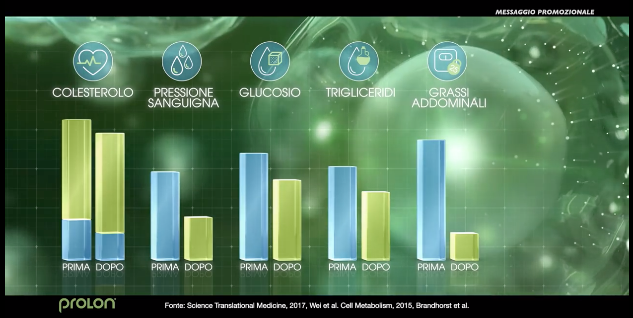 Nello spot (che si può ancora guardare sul canale YouTube ufficiale) si afferma che ProLon è “l’unico programma alimentare che grazie al protocollo brevettato della dieta mima digiuno attiva un processo di rinnovamento e rigenerazione cellulare, che aiuta il tuo corpo a ritrovare il benessere da dentro”. La voce narrante poi prosegue spiegando come “test clinici hanno dimostrato che ProLon aiuta a ristabilire i normali livelli di colesterolo, pressione, glucosio, trigliceridi e grasso addominale”