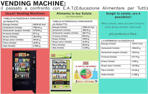 Il progetto è intervenuto sui fattori ambientali obesogeni, sostituendo le tradizionali macchinette, con i nuovi distributori “Alimenta la tua salute”, che contengono solo frutta e verdura fresca, frutta essiccata, succhi di frutta, smoothies senza zuccheri aggiunti e yogurt da bere. La selezione dei prodotti è stata fatta scegliendo quelli con poco sale, tante fibre, niente sciroppo di glucosio e fruttosio, niente grassi trans e idrogenati, ma nemmeno olio di palma e cocco, oppure ricchi di saturi e colza. Il progetto prevede anche diverse lezioni di educazione alimentare, l’invio di messaggi a studenti e genitori con consigli alimentari, un pedometro per misurare l’attività fisica e una bottiglia riutilizzabile per incentivare il consumo di acqua.