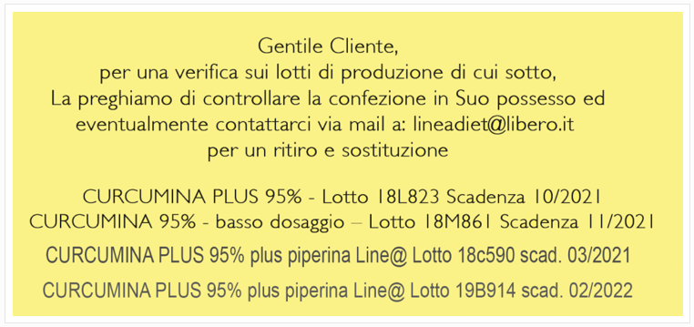 - Curcumina Plus 95% piperina a marchio linea@ lotti 19B914 con scadenza 02/2022 e 18e590 con scadenza 03/2021 (NI.VA)