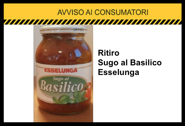 Esselunga ha ritirato dagli scaffali dai punti vendita di tutta Italia il sugo al basilico confezionato in barattoli di vetro da 400 grammi con il proprio marchio. L’avviso riguarda esclusivamente le confezioni che sull’etichetta riportano il numero di lotto L104S e indicano come termine minimo di conservazione il mese di aprile 2018 (da consumarsi preferibilmente entro il 04/2018).