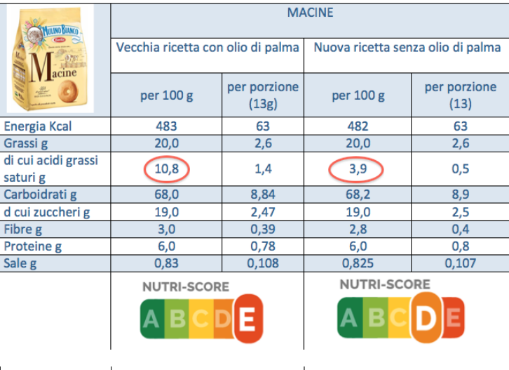In Francia, il ritardo con cui sono arrivate le adesioni delle aziende si può giustificare con la necessità di esaurire gli incarti in magazzino, ma anche quella di modificare la composizione di alcuni prodotti, per migliorare il giudizio attribuito dal semaforo. Le patatine McCain, per esempio, hanno sostituito l’olio di palma con quello di girasole e adesso il profilo nutrizionale dei prodotti ha guadagnato le posizioni A e B. Diverso il caso di Bonduelle che avendo in assortimento preparati a base di legumi e verdure ha già oltre il 90% dei prodotti in categoria A o B. La catena di supermercati Intermarché ha deciso di ridurre del 30% lo zucchero nei dessert a base di latte, di diminuire il sale nelle zuppe e nei salumi e di sostituire l’olio di palma con quello di girasole. Si tratta di scelte importanti che possono solo contribuire a migliorare le caratteristiche nutrizionali dei prodotti alimentari. Tempo fa anche noi avevamo confrontato l’etichetta a semaforo dei biscotti Macine, Ritornelli e Abbracci Mulino Bianco preparati con olio di palma, con la versione senza olio tropicale, rilevando un miglioramento del profilo nutrizionale, passato da rosso a arancione. Un interrogativo irrisolto riguarda il diverso comportamento delle aziende in Franca e in Italia, Ci sono marchi come come Bonduelle e catene di supermercati come Auchan che in Francia hanno da subito sposato l’etichetta a semaforo, mentre in Italia non hanno l’intenzione di portare avanti il progetto.