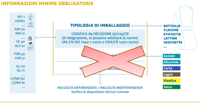 Rimane invece in vigore l’obbligo di apporre su tutti gli imballaggi (siano essi primari, secondari o terziari), la codifica identificativa del materiale secondo la Decisione 97/129/CE.