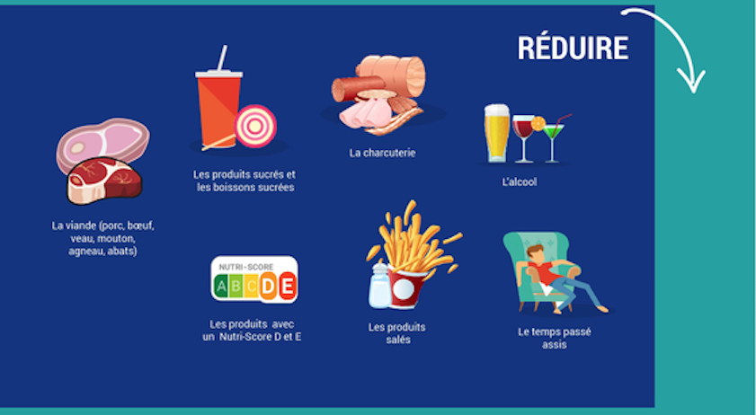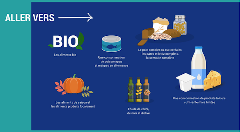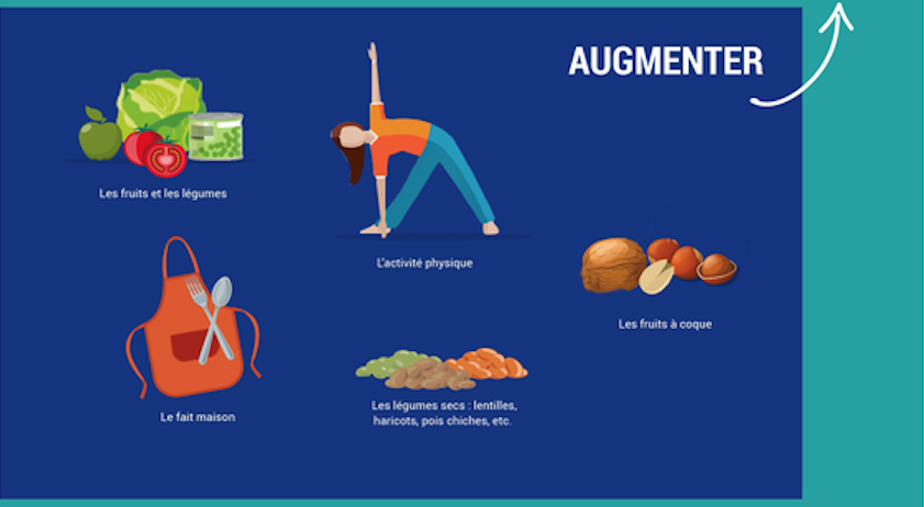 Secondo le linee guida francesi, tra gli alimenti il cui consumo è da aumentare per una sana alimentazione figurano come sempre frutta e verdura, che devono raggiungere almeno cinque porzioni al giorno, ma anche frutta secca in guscio e legumi secchi, che per la prima volta sono oggetto di raccomandazioni di consumo specifiche. Sono da incrementare anche l’attività fisica e la cucina casalinga al posto dei pasti fuori casa e a base di cibi pronti ultra-trasformati.