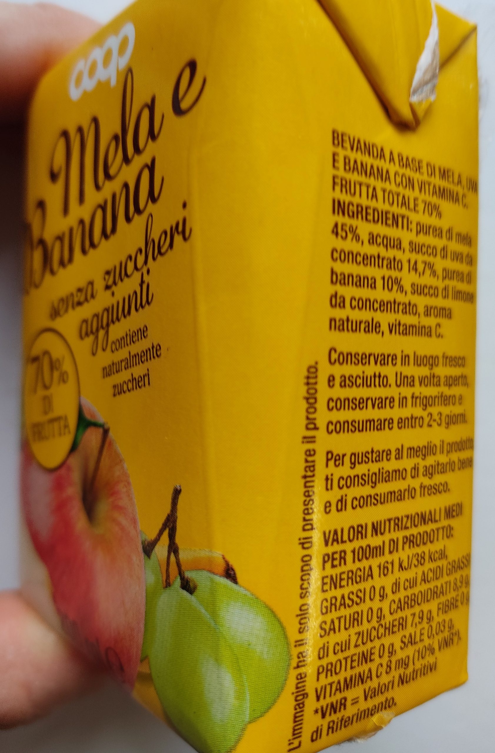 Un esempio di “slogan salutistici” furbetti è il “senza zuccheri aggiunti” che ho trovato su questi succhi di frutta a marchio Coop: li ho acquistati sapendo che la frutta già contiene zucchero di suo ma mi aspettavo una quantità molto inferiore ai succhi “tradizionali” con zucchero aggiunto. Una volta a casa esaminata l’etichetta scopro che contiene “succo d’uva” non dichiarato sul frontale. Evidentemente l’alto contenuto zuccherino dell’uva permette di evitare l’aggiunta di zucchero semplice e di poterlo scrivere sul frontale, anche se gli zuccheri totali contenuti sono poi simili a quelli di tutti i normali succhi di frutta in vendita. Personalmente lo trovo uno stratagemma sì lecito ma furbo.