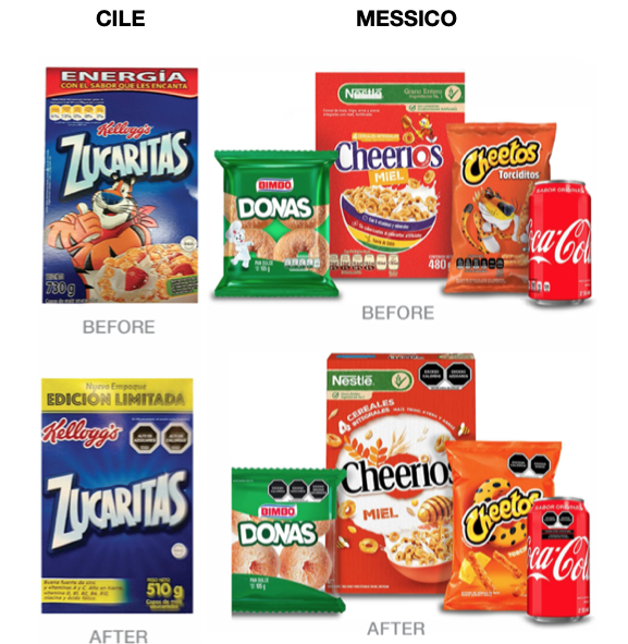 In Cile gli alimenti con bollino nero non possono essere pubblicizzati o venduti nelle scuole e saranno oggetto di future tasse in aggiunta alle tasse già esistenti come la sugar tax per i soft drink. Inoltre questi alimenti non potranno più usare personaggi o cartoni animati, persone o animali che attirino l’attenzione dei bambini. Non potranno essere utilizzati neppure musiche per bambini, regali, accessori o adesivi, situazioni che rappresentino la vita quotidiana dei bambini, applicazioni interattive, giochi o concorsi. Ecco come cambiano le confezioni dei prodotti prima e dopo l’introduzione di questo programma di prevenzione dell’obesità, in Cile e in Messico.