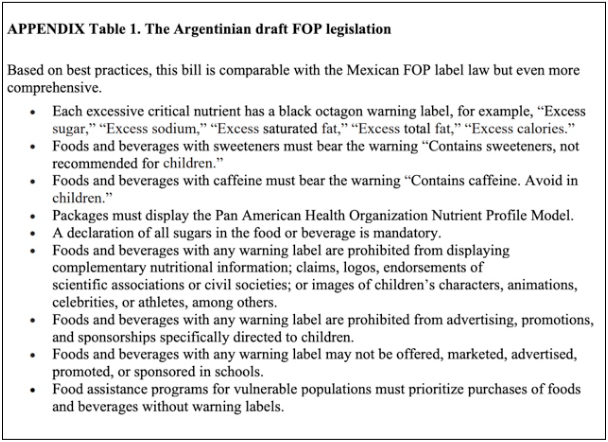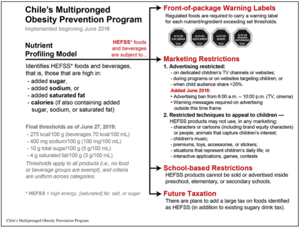 Il Cile ha implementato un programma molto interessante: ha definito un profilo nutrizionale che si applica a tutti gli alimenti e bevande, senza alcuna eccezione. I prodotti alimentari con un alto contenuto di zucchero, sodio, acidi grassi saturi e calorie vengono definiti con l’acronimo Hefss (high energy, (saturated) fat, salt or sugar) e vengono identificati con un bollino nero ottagonale dove viene specificato che sono ad alto contenuto di grassi saturi, sale, zuccheri e/o calorie. I valori dei profili nutrizionali (riferiti a 100 g o ml) oltre i quali scatta il bollino nero sono: 275 kcal per gli alimenti (70 per le bibite), 400 mg di sodio, 10 g di zucchero (5 per le bevande), 4 g di grassi saturi (3 per le bibite). Questo sistema risulta ancora più semplice e immediato di altre etichette a semaforo adottate in Europa (etichetta britannica e francese).