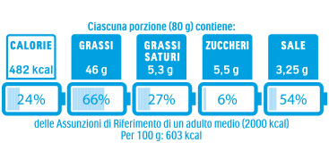 Le batterie invece contengono l’informazione veramente significativa: la quantità di calorie, grassi saturi e sale contenuti in una porzione confrontata al fabbisogno medio giornaliero.