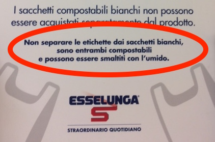 I clienti più attenti all’ambiente avevano imparato ad applicare l’etichetta adesiva del prezzo nella parte alta del sacchetto in modo da poterla ritagliare con le forbici e utilizzare la borsina per l’umido. È facile immaginare che nella maggior parte dei casi i sacchetti della frutta e della verdura finivano nel bidone dell’umido con l’etichetta contaminando così il rifiuto organico.Iper etichetta sacchetti compostabile Etichette