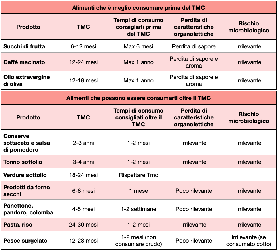 La data di scadenza indica l’intervallo di tempo entro il quale un alimento può essere consumato in sicurezza, mentre il termine minimo di conservazione garantisce che entro la data segnalata il prodotto mantiene pressoché inalterate le sue caratteristiche organolettiche, ma, appunto, è ‘spesso buono oltre’. E questo ‘oltre’ a volte può essere lungo anche diverse settimane, o addirittura mesi. La pasta, le passate di pomodoro e il tonno sott’olio, ad esempio possono essere consumati anche uno o due mesi oltre il Tmc, mentre il caffè macinato e l’olio extravergine sono prodotti che è meglio consumare prima della data indicata dal produttore, che solitamente è di 18-24 mesi. In questi casi conviene non superare i 12 mesi per evitare perdite di aroma e sapore che rappresentano una caratteristica importante per questi prodotti. Nella tabella qui sotto trovate diversi gruppi di alimenti con il consumo consigliato oltre o prima del Tmc (qui l’articolo completo).