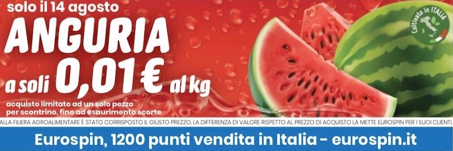 L’evento più eclatante sul fronte dei prezzi è stato, però, la vendita di angurie il 14 agosto a 0,01 centesimi di €/Kg, con il vincolo di un solo pezzo per scontrino. Un prezzo assurdo che ha creato polemiche nel settore. In quel caso però, quantomeno, diversamente da quanto è accaduto con gli altri prodotti e sta accadendo con le arance, non si trattava di una primizia. Per essere corretti, comunque, va precisato che nel volantino di Eurospin realizzato per promuovere la vendita dell’anguria super scontata si precisa che “alla filiera agroalimentare è stato corrisposto il giusto prezzo. La differenza di valore rispetto al prezzo di acquisto è stata messa da Eurospin per i suoi clienti”.