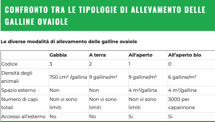 Nei sistemi d’allevamento alternativi alle gabbie le galline hanno accesso all’esterno con minimo 4m2 di spazio. Nei sistemi biologici la densità di allevamento è limitata a 6 galline/m2 all’interno del capannone e il numero massimo di animali allevabili è 3.000; di solito alle galline non viene “tagliato” il becco e viene concesso loro più spazio all’esterno (10 m2 /animale).