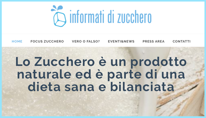 Il sito InformatidiZucchero.it è un “progetto promosso da Aidepi, Assobibe e Unionzucchero, le 3 associazioni di categoria che rappresentano la I e II trasformazione industriale dello zucchero, in particolare nell’ambito della produzione, del dolciario e delle bevande analcoliche”. Il loro sito dichiara che “l’obiettivo è la promozione di una corretta informazione sulla produzione italiana di zucchero e sul suo utilizzo come ingrediente, per facilitare la conoscenza di questo nutriente, spesso oggetto di critiche e pregiudizi”.