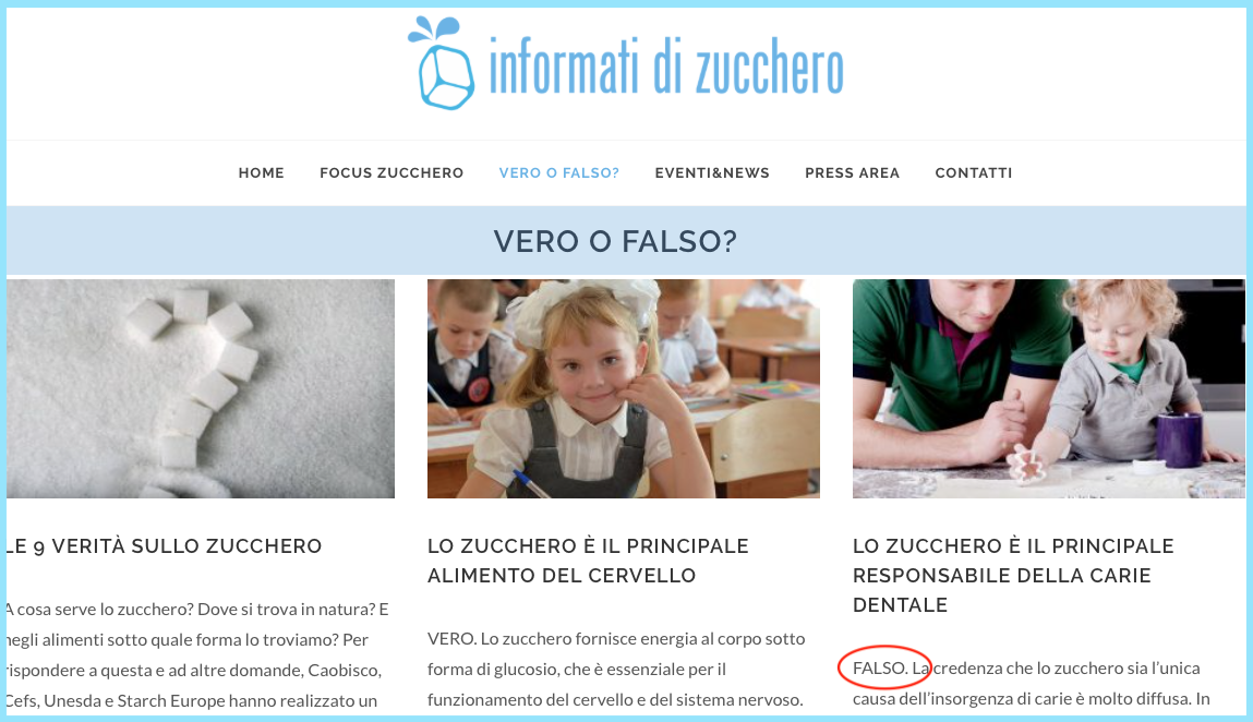 Il secondo mito nella rubrica Vero o Falso è emblematico. Invece di porre la domanda in maniera semplice: “Lo zucchero causa la carie? Risposta: VERO” il sito gioca con le parole come un prestigiatore e rovescia il messaggio che viene così formulato “Lo zucchero è il principale responsabile della carie dentale. Risposta: FALSO… (vedi tabella sotto).