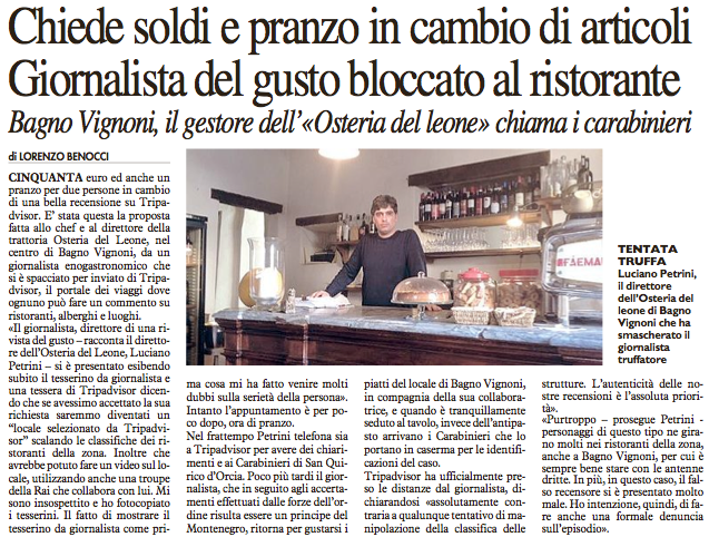 La vicenda del falso inviato di TripAdvisor che si presenta all’Osteria del Leone e chiede soldi per un recensione speciale, denunciata da Il Fatto Alimentare, ha avuto un grosso riscontro in rete e su molti siti specializzati in food. Anche il quotidiano la Nazione ha pensato di proporre un articolo ai suoi lettori raccontando la storia.