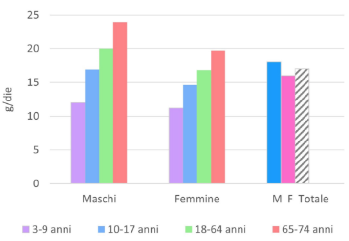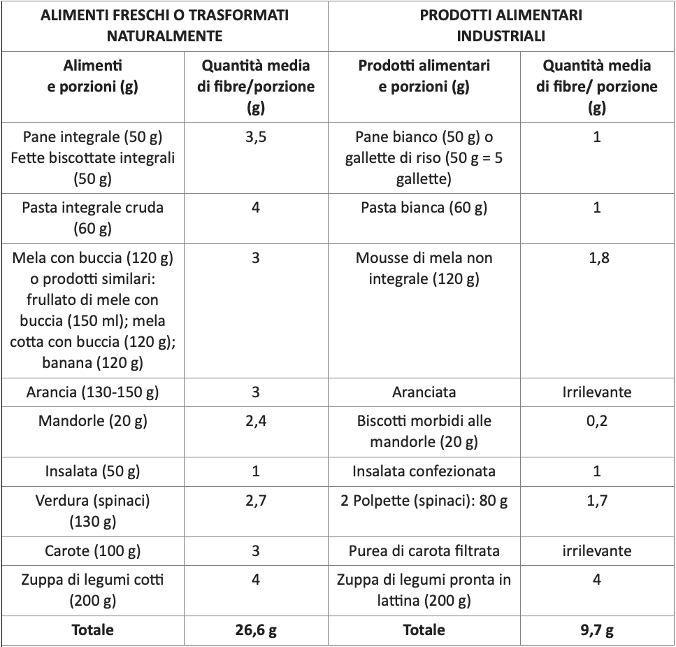 Va comunque considerato che, se, come spesso succede, tale raccomandazione viene disattesa, sostituendo questi alimenti con prodotti alimentati industriali, il consumo di fibre risulta significativamente inferiore a quello raccomandato (tabella).