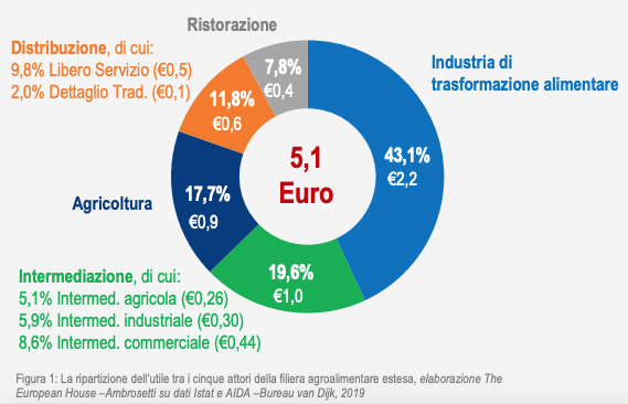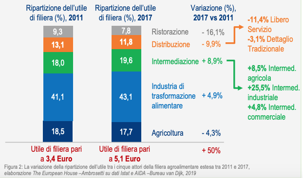 Ma secondo lo studio di Ambrosetti, anche la ripartizione di questi 5,1 euro è diversa da come spesso si sente dire. La maggior parte dei guadagni, il 43,1%, vanno all’industria di trasformazione, un grosso insieme di aziende che va dalle piccole imprese artigianali ai grandi produttori di merendine, come Barilla e Ferrero. Il 19,6% finisce nelle tasche di intermediari e grossisti, il 17,7% agli agricoltori e il 7,8% alla ristorazione. La distribuzione grande e piccola, invece, riceve solo l’11,8%, in calo rispetto alla precedente rilevazione del 2011 di quasi il 10%.