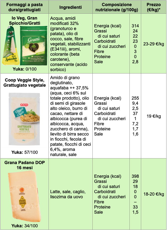 Considerando i formaggi tipo grana, abbiamo visto Grattì a marchio Io Veg, proposto come spicchio oppure grattugiato, e il Grattugiato vegetale firmato Coop. Il prodotto Io Veg è a base di olio di cocco e amidi, contiene fosfato tricalcico (E341iii) come stabilizzante e acido sorbico come conservante, mentre quello firmato dalla catena vede come primi ingredienti amido di grano, acquafaba (preparato di acqua e ceci) e olio di girasole alto oleico. Il Grattì contiene il 24% di grassi, tracce di proteine e 2,8% di sale; il prodotto Coop invece 9,4 g di grassi per 100 g, 1,7 g di proteine e 1,6 di sale.