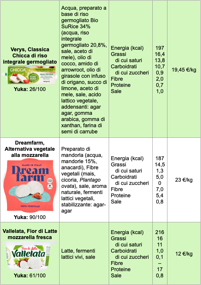 Per confronto consideriamo la ‘vera’ mozzarella Vallelata che, in 100 g, contiene 16 g di grassi e 17 g di proteine e nella valutazione di Yuka merita un buon 61/100. È vero che i grassi sono piuttosto elevati, ma la ricchezza proteica e l’assenza di additivi la rendono preferibile a molte alternative vegetali. Il costo va da 16 a 24 €/kg per i prodotti vegani, contro circa 12 per la mozzarella Vallelata.