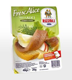 La Rizzoli, n’azienda specializzata nel settore delle conserve ittiche, propone una nuova confezione di filetti di alici in olio di oliva, caratterizzata da piccole porzioni in vaschetta. L’intento è di aumentare le occasioni di consumo. Il prodotto si presenta in due versioni: filetti in olio di oliva e filetti in salsa piccante. Il produttore sull’etichetta propone una sorta di “consumo veloce, quando scatta la voglia, magari insieme agli amici” e suggerisce una ricetta, in questo caso di appetizer.