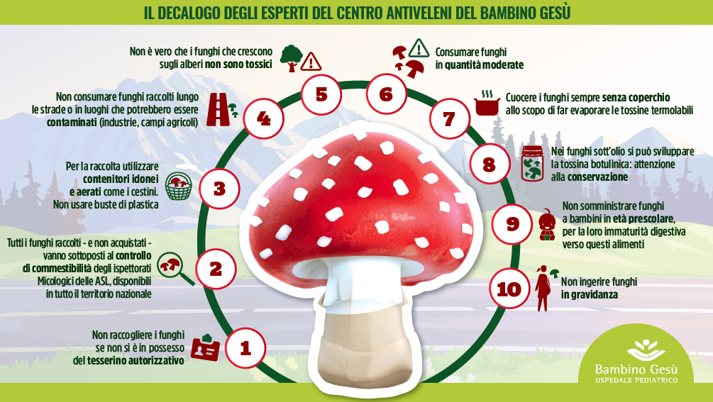 Fra settembre e ottobre è stagione di funghi, e quindi è anche il periodo in cui aumentano i casi di intossicazione e avvelenamento. Per ovviare a questi pericoli, il Centro Antiveleni dell’Ospedale Pediatrico Bambino Gesù ha stilato un vademecum di dieci regole per mangiare i funghi in sicurezza.