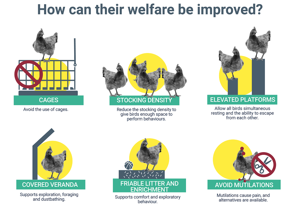 Per fare un esempio, gli esperti dell’Efsa raccomandano, oltre all’eliminazione delle gabbie, di fornire lettiere asciutte e friabili, con materiali di arricchimento in grado di stimolare i comportamenti naturali degli animali e piattaforme elevate per permettere alle galline di riposarsi. Inoltre, per i polli da carne, si consiglia di limitare il ritmo di accrescimento dei broiler a 50 grammi al giorno (si tratta di un tasso di crescita molto vicino a quello delle razze a lento accrescimento impiegate nell’allevamento biologico che prevede 45 g/die).