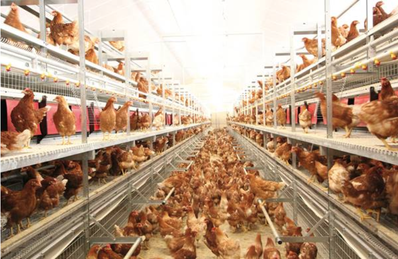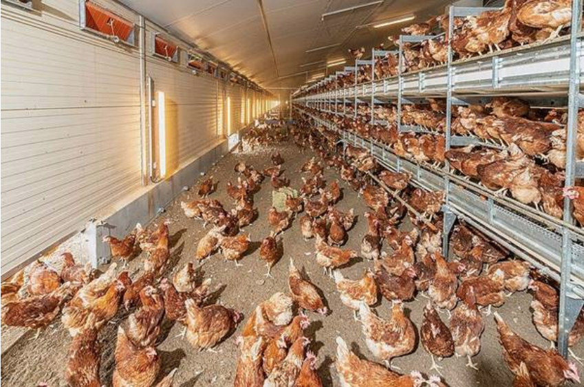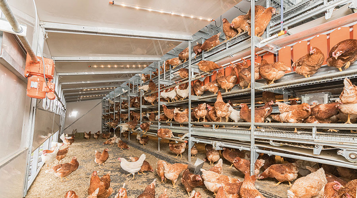 2.Allevamento a terra o voliera: un massimo di nove capi al metro quadrato senza accesso all’esterno. All’interno le galline sono libere di muoversi su lettiera e su strutture ad un piano (posatoio) o a più piani (voliera) dove si trovano abbeveratoi per l’acqua, mangiatoie per il cibo e i nidi dove fare l’uovo. Ventilazione e climatizzazione sono sempre presenti e sono controllati da